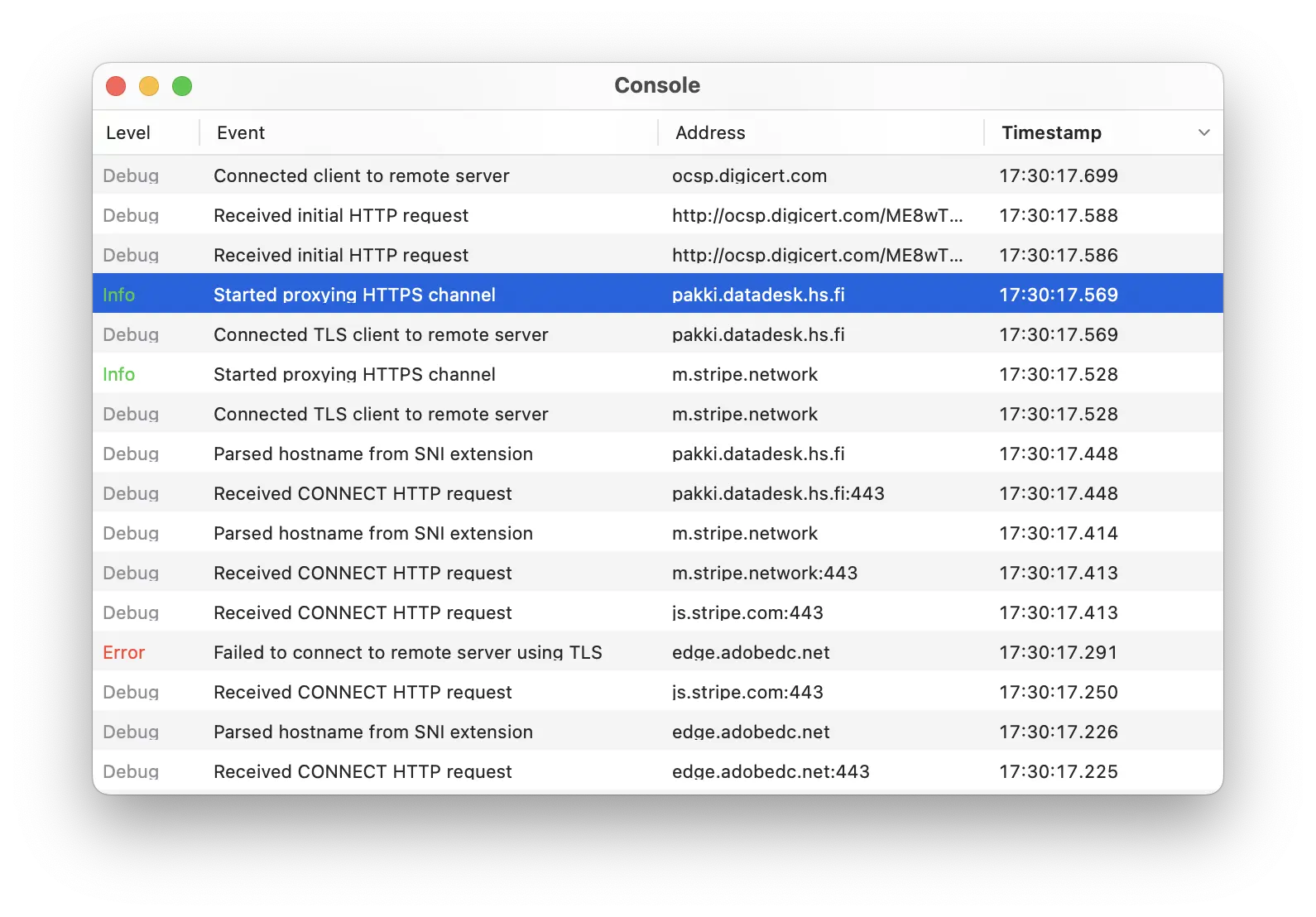 Open Console from the Window menu to follow log events from the proxy in real time. This can be useful when debugging why certain traffic is not visible in Proxygen message history.