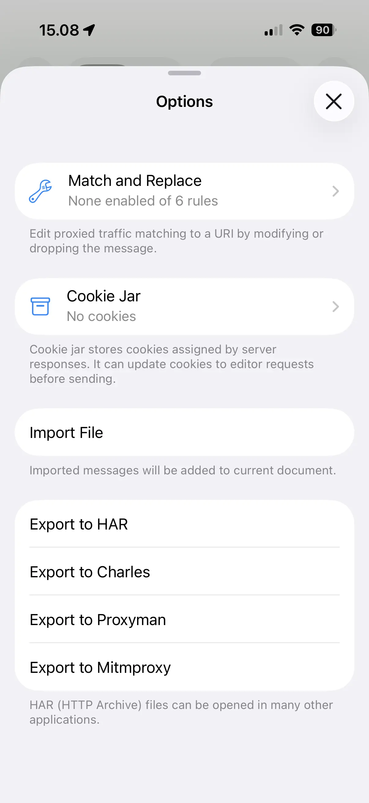 In Proxygen iOS app, import a file by opening Options and tapping Import File. Its contents are added to the current document. Export all HTTP messages to a file by selecting one of the exporting options.