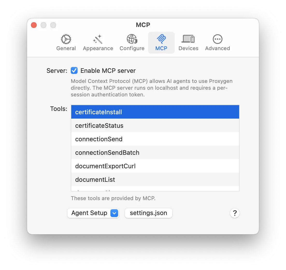 Open Preferences → MCP. The Agent Setup popup and the settings.json button generate the configuration needed to register Proxygen with common agents.