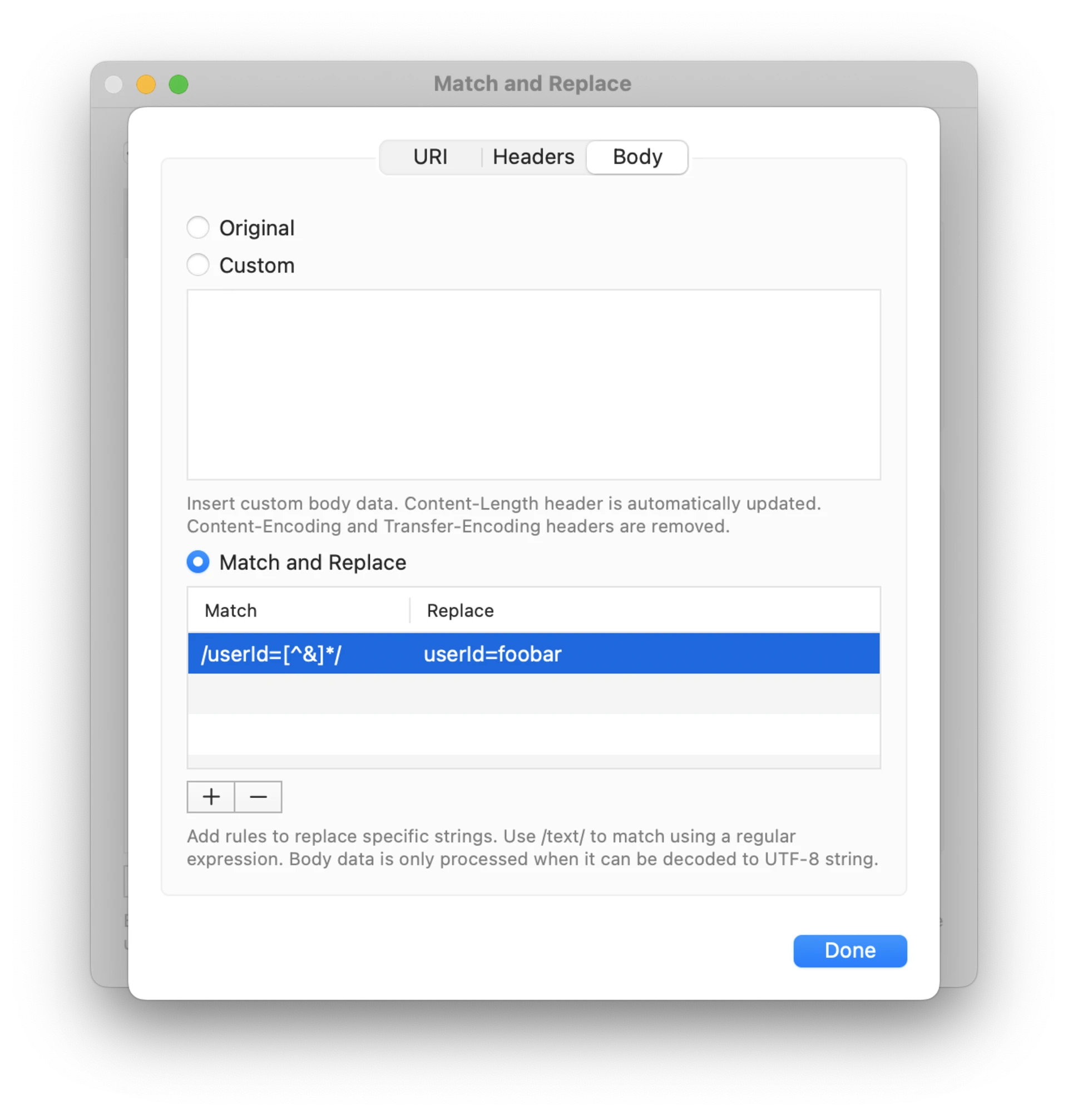 - Body tab allows you to keep original body data, replace it with custom text, or replace a matching range of the body text with a new value. Replacement supports regular expressions such as