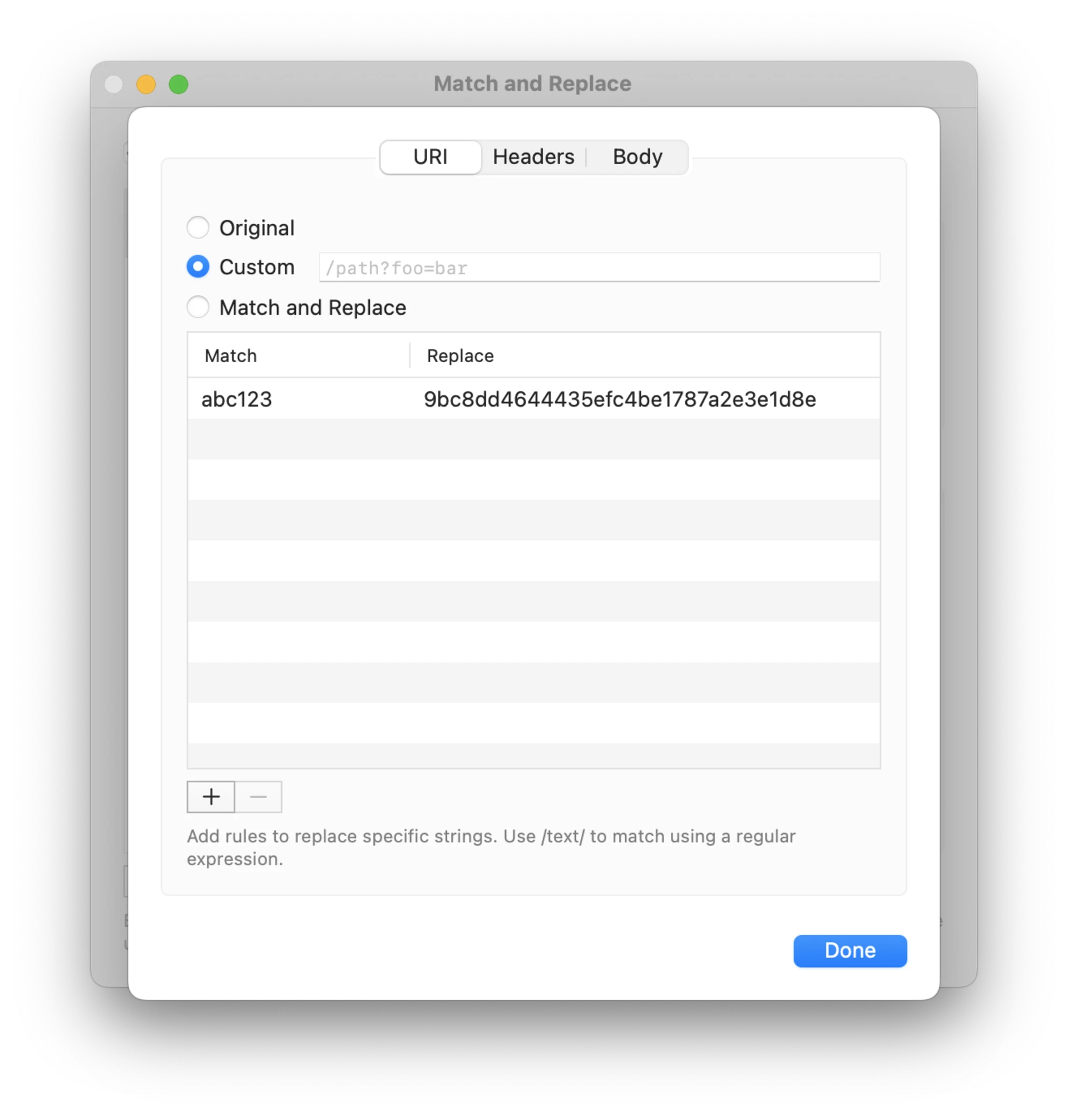 - URI tab allows you to keep original URI, replace it with a custom URI, or replace a matching range of URI with a new value. Replacement supports regular expressions such as