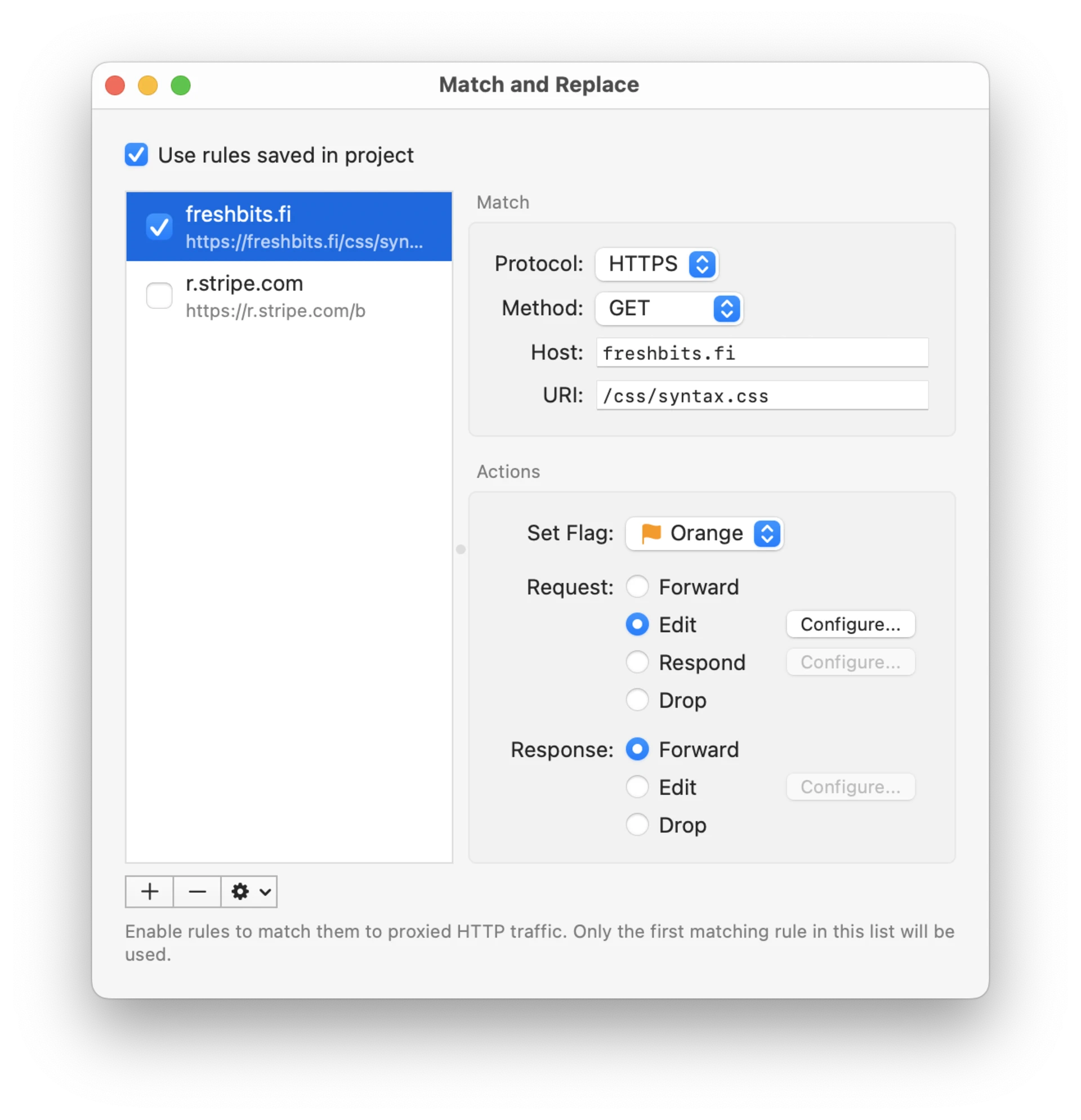 Rewrite rules can be saved both globally in Proxygen app and in each project document. Toggle Use rules saved in project to enable global or project specific rules.